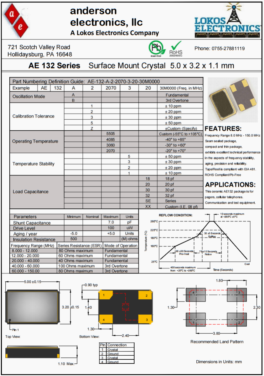 6G移動通訊晶振,Anderson高品質晶體,AE-132-A-2-2070-3-20-30M0000晶振,美國Anderson晶振公司,安德森晶振,進口晶振,AE-132晶振,無源晶振,貼片晶振,超小型晶振,2016晶振,6G通訊設備晶振,6G路由器晶振,6G網絡終端晶振,無源晶振,貼片晶振,無人機晶振,汽車輔助駕駛晶振,低損耗晶振,高品質晶振。產品具有高精度超小型的表面貼片型石英晶體振蕩器,最適用于移動通信終端的基準時鐘等移動通信領域.比如智能手機,無線通信,衛星導航,平臺基站等較高端的數碼產品,晶振本身小型,薄型具備各類移動通信的基準時鐘源用頻率,貼片晶振具有優良的電氣特性,耐環境性能適用于移動通信領域,滿足無鉛焊接的高溫回流溫度曲線要求,符合RoHS/無鉛。